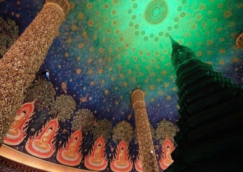 エメラルド色の天井画が美しいワット・パクナムも外せません。