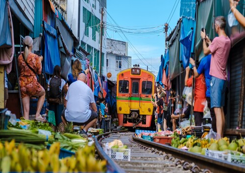 列車が市場の中を走ることで有名なメークロン線路市場。迫力ある列車通過シーンは必見。