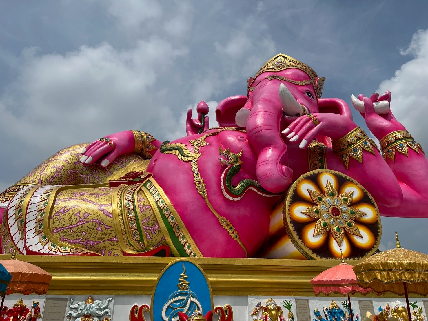 ピンクの巨体の周りにはガネーシャの乗り物とされるカラフルなねずみの像が並んでいます。